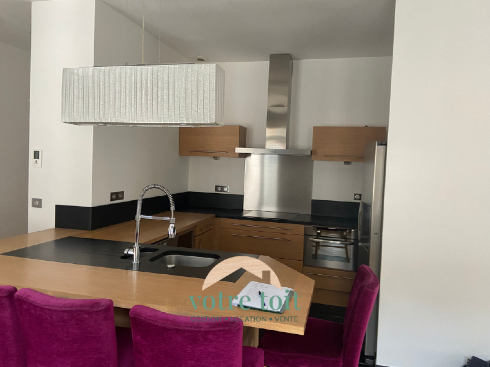 - Un spacieux séjour lumineux avec cuisine ouverte, entièrement aménagée et équipée (four, plaque de cuisson 2 feux, hotte, frigidaire américain),